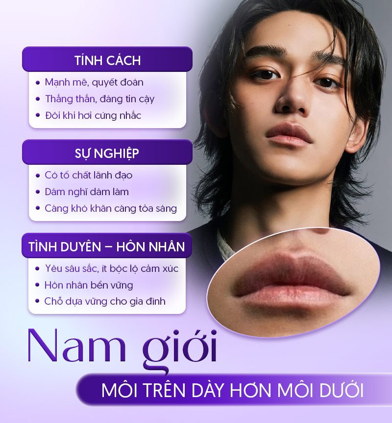 Đàn ông có môi trên mỏng nhưng môi dưới dày thường là người giỏi tạo cảm xúc thông qua lời nói. Họ biết cách nói những lời ngọt ngào, dễ khiến người khác xiêu lòng, đặc biệt trong các mối quan hệ tình cảm. Tuy nhiên, theo xem tướng, kiểu môi này cũng cho thấy sự thiếu nhất quán giữa lời nói và nội tâm. Lời nói có thể hoa mỹ nhưng mức độ chân thành không cao, khiến các mối quan hệ lâu dài gặp nhiều thử thách. Đây là mẫu đàn ông phong tình, dễ trải qua nhiều mối quan hệ nhưng khó gắn bó trọn vẹn.